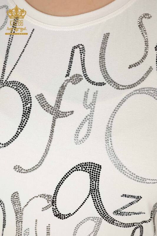 Grossiste Chemisier Femme Cristal Pierre Brodée Lettre Détaillée Ecru - 78833 | KAZEE