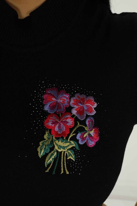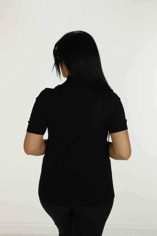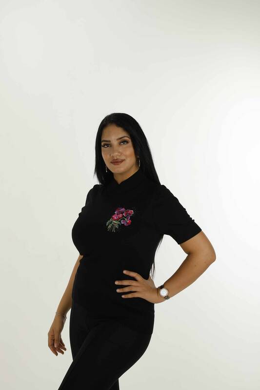Kurzärmliger, bestickter Strickpullover mit hohem Kragen, Schwarz – 30928 | KAZEE