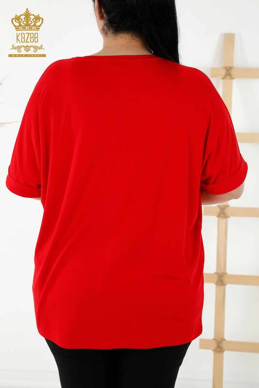 Hurtownia damska bluzki z dekoltem w kształcie litery V, krótkim rękawem, haftem z kamieniami, czerwona - 78882 | KAZEE