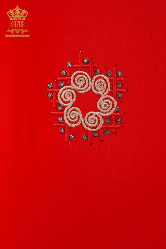 Hurtownia damska bluzki w kwiaty z haftowanym kamieniem w kolorze czerwonym - 78879 | KAZEE