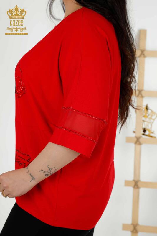 Hurtownia bluzek damskich w kwiaty z haftowanym kamieniem w kolorze czerwonym - 79059 | KAZEE