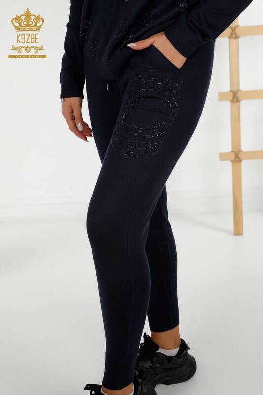 Hurtowy komplet damski dresowy z zamkiem błyskawicznym, haftowaną kieszenią z kamieniem, granatowy - 16276 | KAZEE