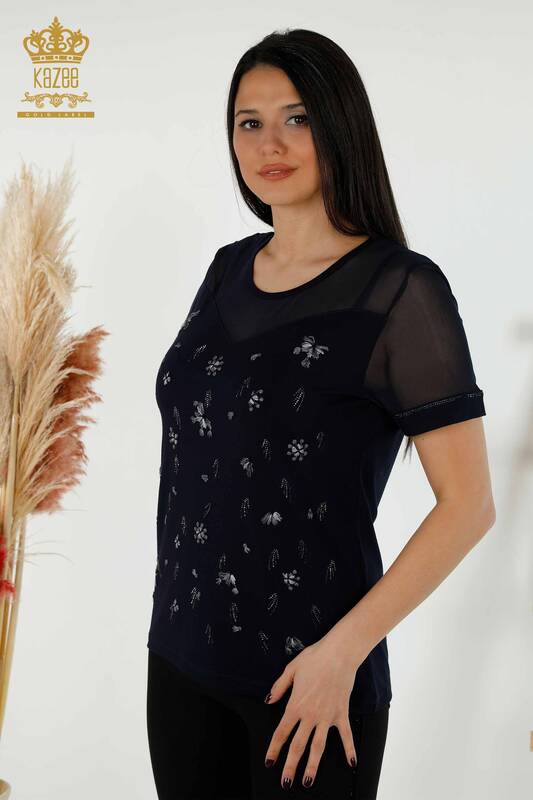 Hurtownia damska bluzka tiulowa szczegółowy kwiatowy wzór haftowany kamieniem granatowy - 79133 | KAZEE