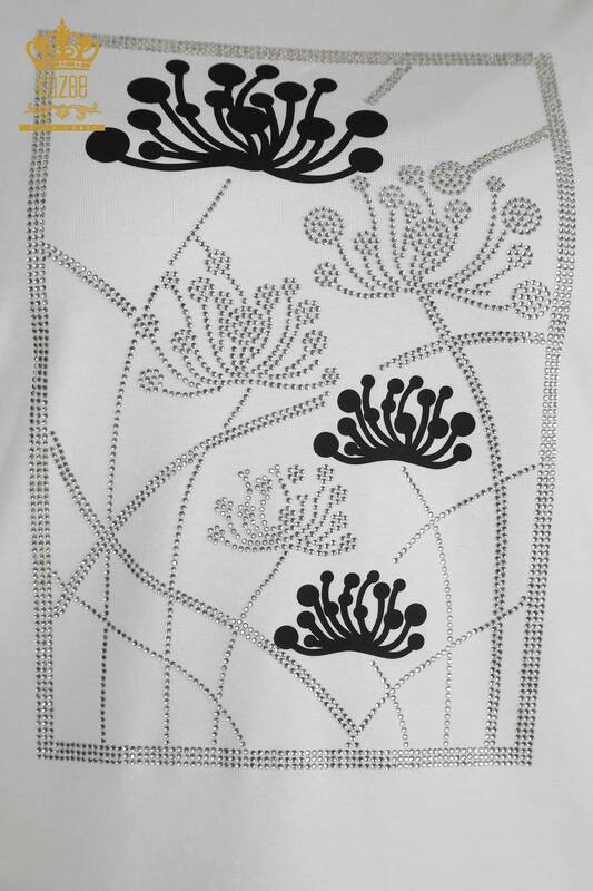 Hurtownia Damska Bluzka z Kamiennym Haftowanym Wzorzystym Krótkim Rękawem, Okrągłym Dekoltem Biała - 79863 | KAZEE