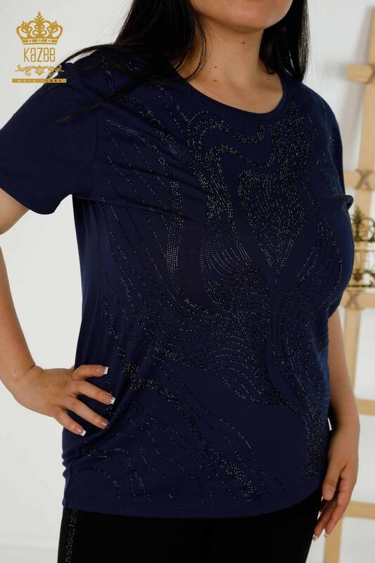Hurtownia Bluzki Damskiej Wzorzyste Kamienie Haftowane Z Krótkim Rękawem Granatowe - 79329 | KAZEE