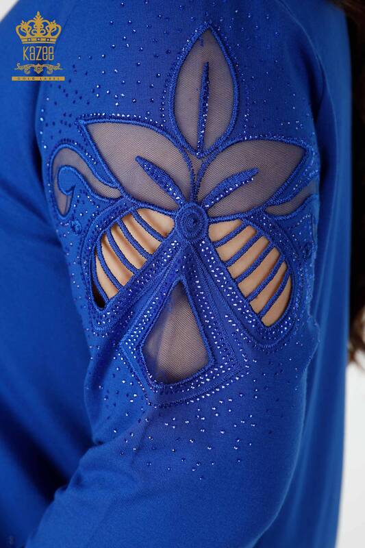 Hurtownia bluzek damskich z haftowanym tiulem i kamieniami, szczegółowymi Saks z dekoltem w kształcie litery V - 77927 | KAZEE