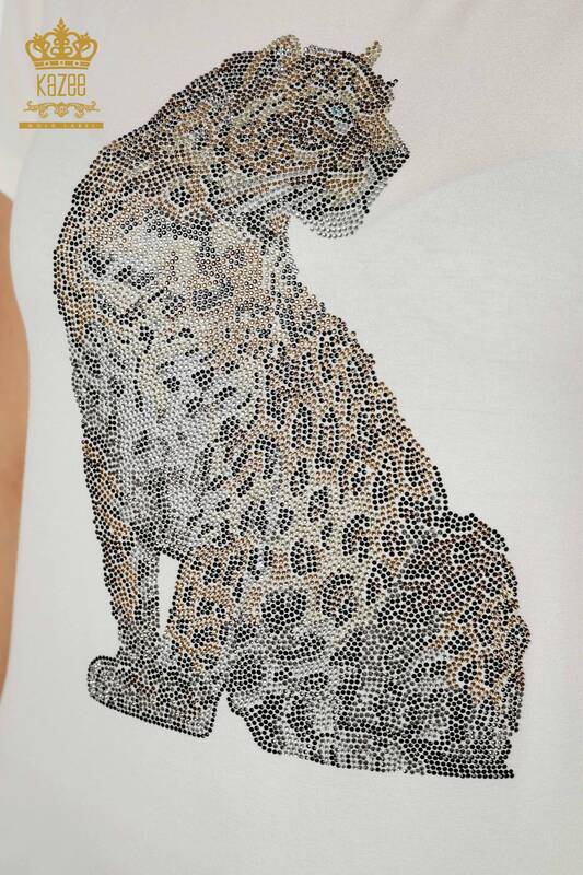 Hurtownia Bluzki Damskiej W Panterkę Wzorzystej Kamienia Haftowanej Krótkim Rękawem Ecru - 78942 | KAZEE