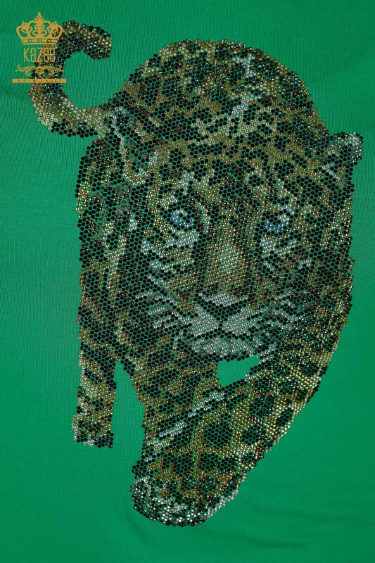 Hurtownia damska bluzki z tygrysim wzorem w kolorowym kamieniu haftowanym zielonym - 79050 | KAZEE