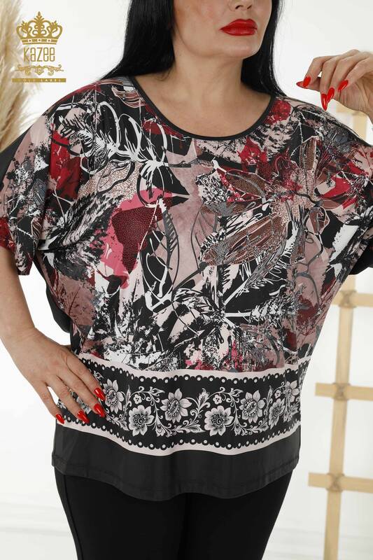 Hurtownia bluzek damskich z nadrukiem cyfrowym i kamieniem, haftowanym krótkim rękawem, czarna - 12060 | KAZEE
