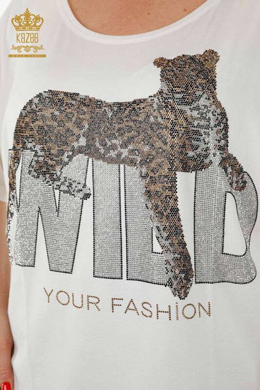 Hurtownia bluzki damskiej Tygrys ze szczegółowym haftem z kamieniem Ecru - 77713 | KAZEE