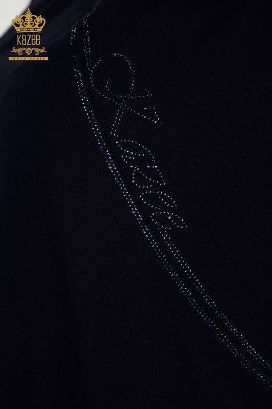 Hurtownia bluzek damskich z haftowanym kamieniem i okrągłym dekoltem z krótkim rękawem granatowa - 79295 | KAZEE