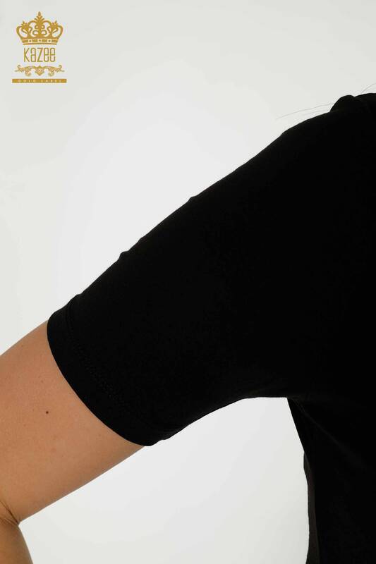 Hurtownia bluzek damskich basic z krótkim rękawem i wysokim kołnierzem czarna - 79264 | KAZEE