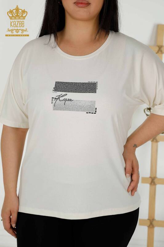 Hurtownia bluzek damskich z krótkim rękawem z haftem w kamienie ecru - 79349 | KAZEE