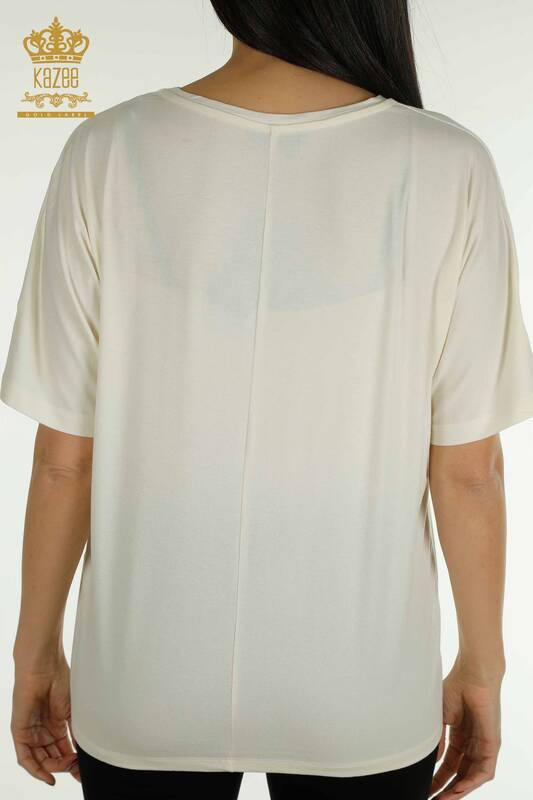 Hurtownia Damska Bluzka Z Krótkim Rękawem Wzorzyste Kamienie Haftowany Tiul Szczegółowo Ecru - 79094 | KAZEE