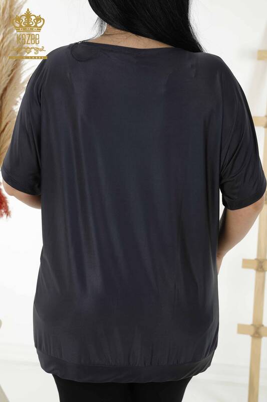 Hurtownia bluzek damskich z nadrukiem cyfrowym, haftowanym kamieniem z krótkim rękawem, granatowa - 77755 | KAZEE