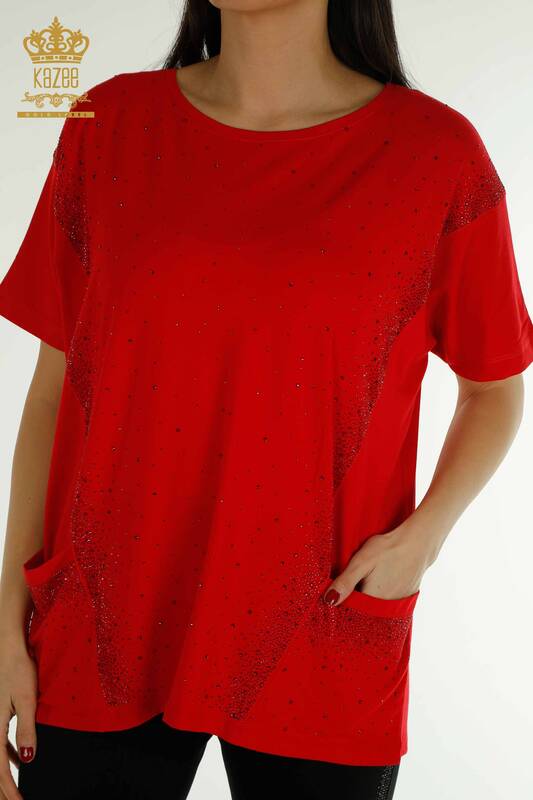 Hurtownia bluzek damskich z dwiema kieszeniami i krótkim rękawem, haftowana kamieniami w kolorze czerwonym - 79293 | KAZEE