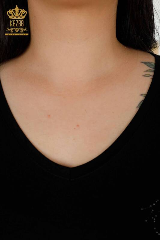 Hurtowa damska bluzka z guzikami, szczegółowa, haftowana kamieniem z krótkim rękawem, czarna - 79297 | KAZEE