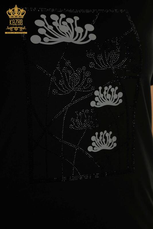 Hurtownia Damska Bluzka z Kamiennym Haftowanym Wzorzystym Krótkim Rękawem Z Okrągłym Dekoltem Czarna - 79863 | KAZEE