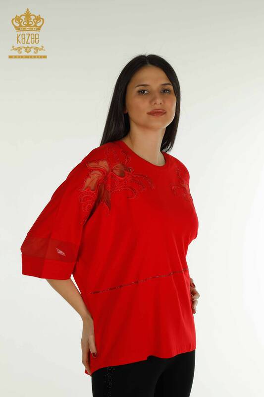 Hurtownia bluzek damskich w kwiaty z haftowanym kamieniem w kolorze czerwonym - 79057 | KAZEE
