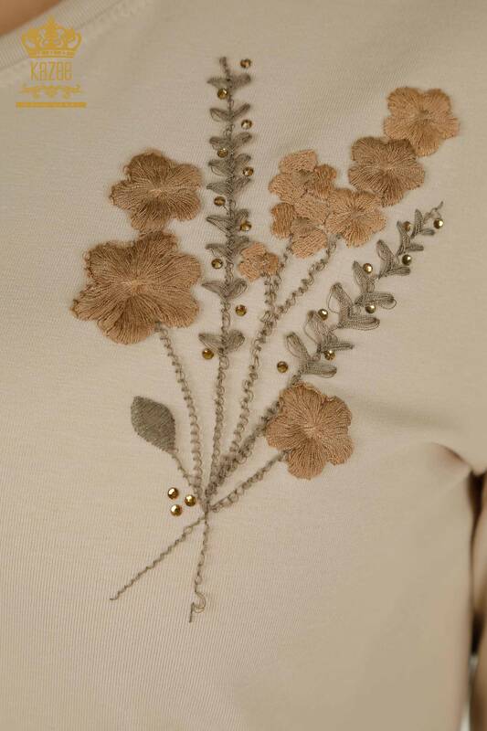 Hurtownia Damska Bluzka Kwiatowa Haftowana Kamień Haftowana Dekolt w Serek Jasny Beż - 79466 | KAZEE