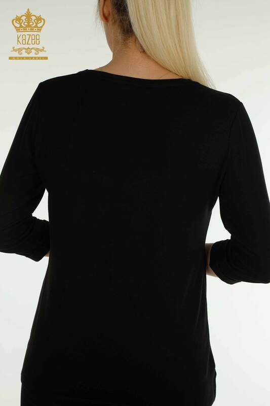Hurtownia bluzek damskich z dekoltem w kształcie litery V, haftowana z kamieniami w kolorze czarnym - 79309 | KAZEE