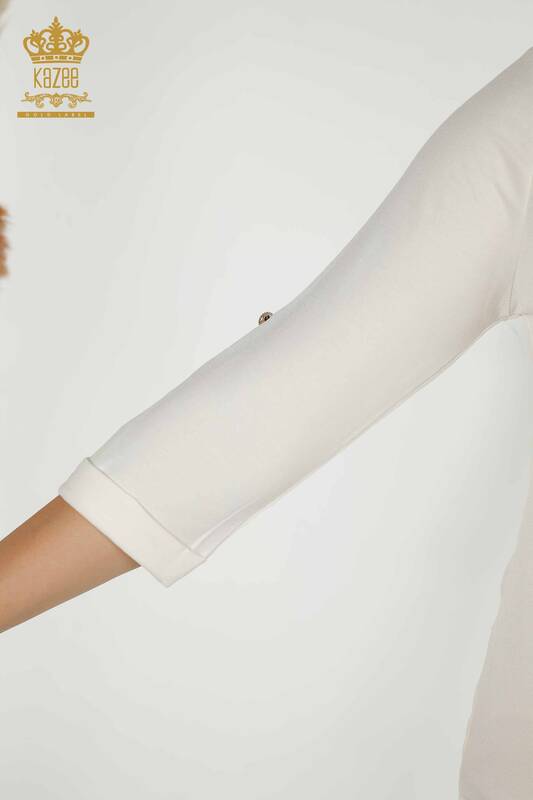 Hurtownia bluzek damskich z dekoltem w kształcie litery V, haftowanymi kamieniami w kolorze ecru - 79309 | KAZEE