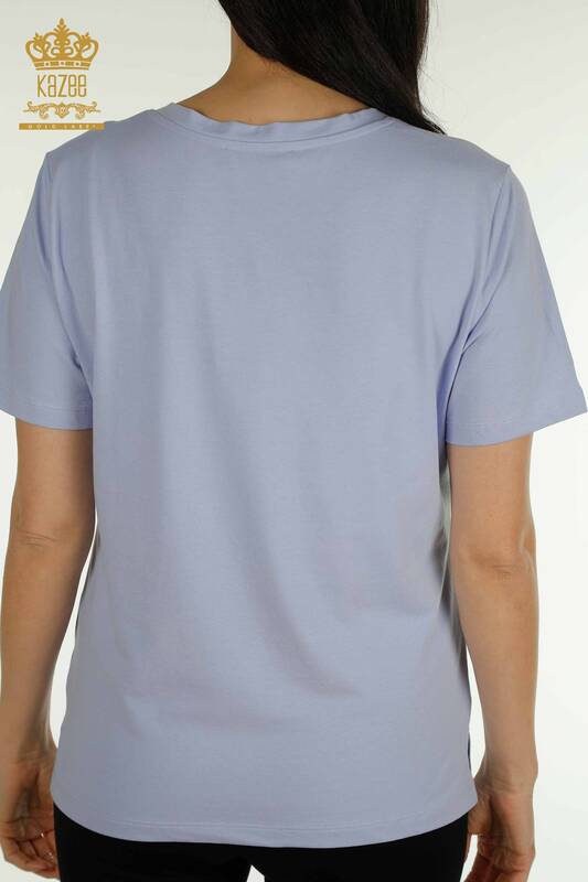 Hurtownia bluzek damskich z dekoltem w kształcie litery V, haftowanym logo z kamieniem, liliowa - 79564 | KAZEE