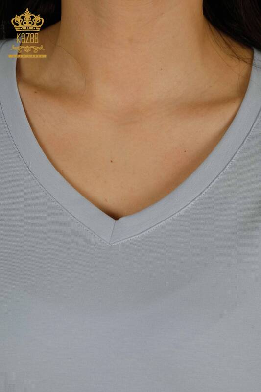 Hurtownia damska bluzki z dekoltem w kształcie litery V, haftowanym logo w kolorze niebieskim - 79564 | KAZEE
