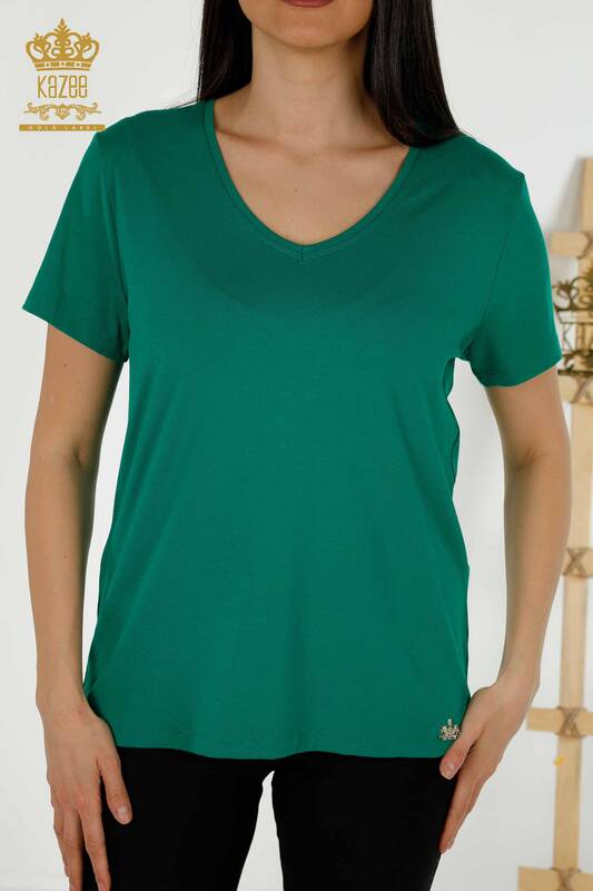 Hurtownia damska bluzki z dekoltem w kształcie litery V, z krótkim rękawem, podstawowa, zielona - 79179 | KAZEE