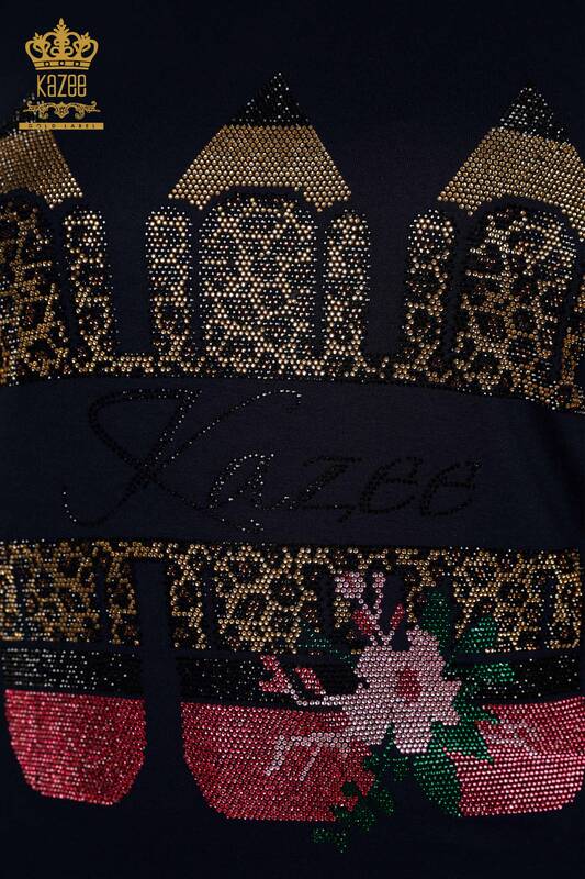 Hurtownia bluzek damskich wzorzystych kolorowych kamieni haftowanych granatowych - 77942 | KAZEE