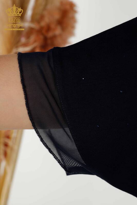 Hurtownia Damska Bluzka Tiulowa z kwiatowym wzorem Szczegółowo haftowana kamieniami Granatowa - 79137 | KAZEE