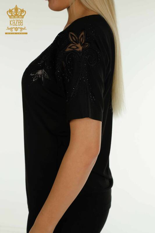 Hurtownia damska bluzki w kwiaty z krótkim rękawem i haftem z kamieniami w kolorze czarnym - 79093 | KAZEE