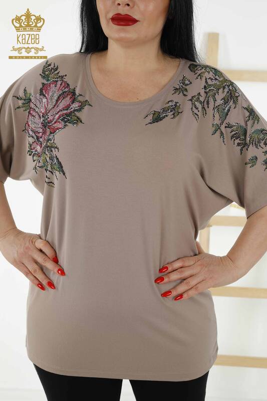 Hurtownia bluzek damskich w kwiatowe wzory z haftowaną norek z kamieniami - 79089 | KAZEE