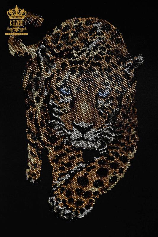 Hurtownia damska bluzki z tygrysim wzorem w kolorowym kamieniu haftowanym czarnym - 79050 | KAZEE
