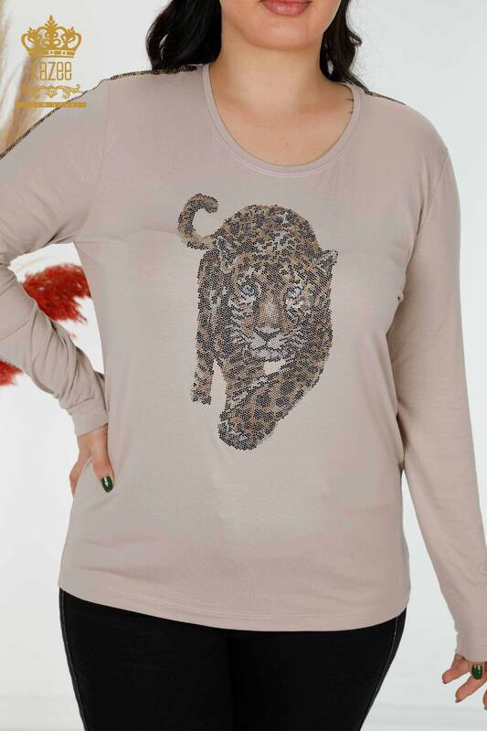 Hurtownia bluzek damskich z tygrysim wzorem w kolorowe kamienie haftowane norek - 79050 | KAZEE