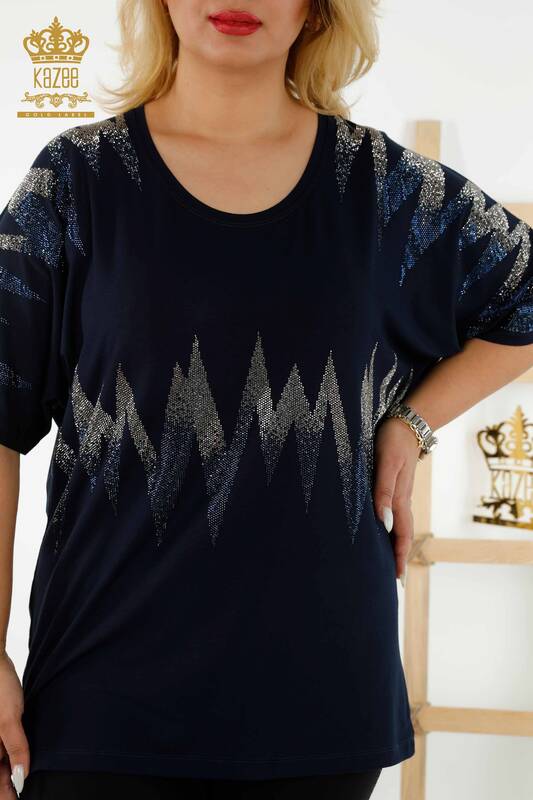Hurtownia bluzek damskich z krótkim rękawem we wzorzyste kamienie haftowane granatowe - 79109 | KAZEE