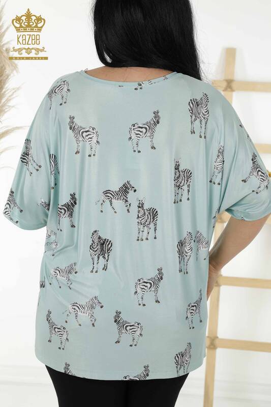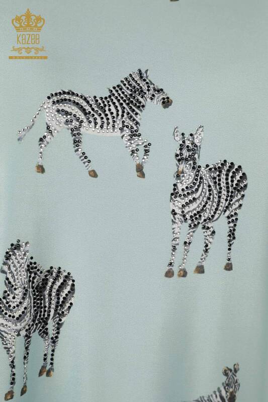 Hurtownia bluzek damskich z haftem w kamienie i krótkim rękawem ze wzorem zebry miętowej - 77690 | KAZEE