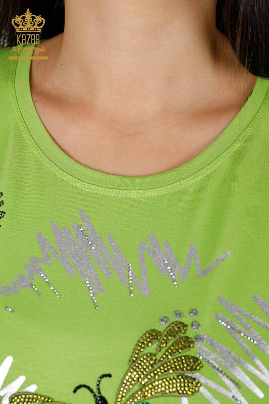 Hurtownia bluzek damskich w motyle z haftowanym kamieniem w kolorze pistacjowym - 78926 | KAZEE
