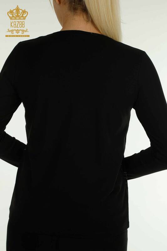 Hurtownia bluzek damskich z długim rękawem, haftowanymi kamieniami, czarna - 79374 | KAZEE