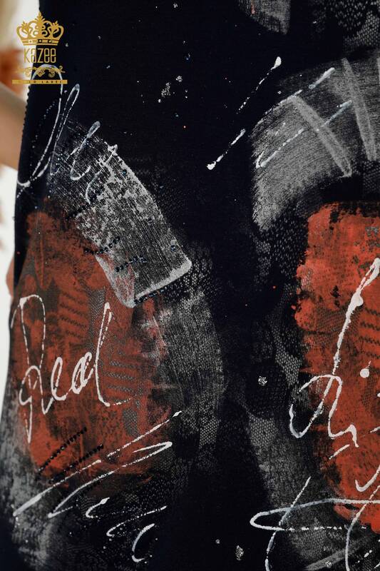 Hurtownia Bluzki Damskiej Z Krótkim Rękawem Kamiennym Haftowanym Wzorzystym Granatowym - 79115 | KAZEE