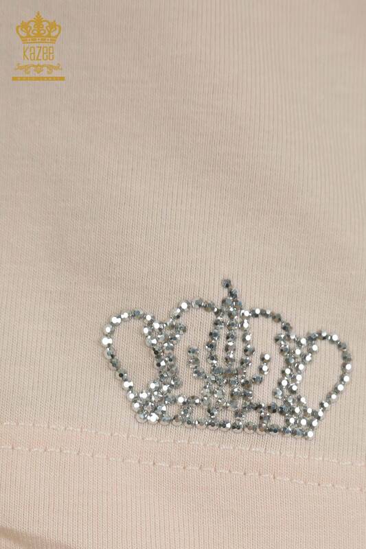 Hurtownia bluzek damskich z krótkim rękawem i kamieniami, haftowanym dekoltem w kształcie litery V, jasny pudrowy - 79561 | KAZEE