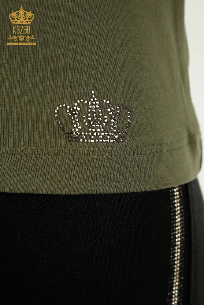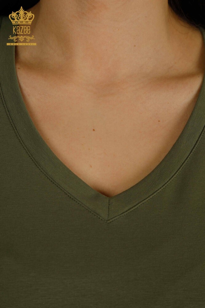 Hurtownia bluzek damskich z krótkim rękawem i kamieniami, haftowanym dekoltem w szpic Khaki - 79561 | KAZEE