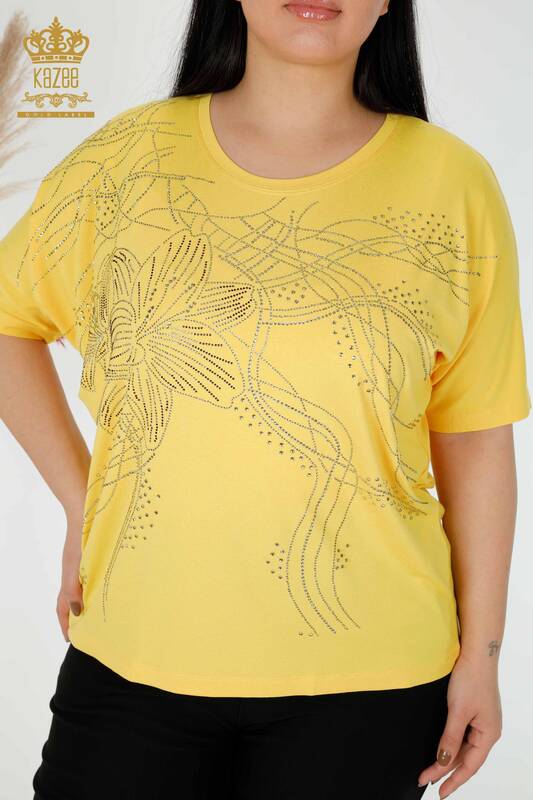 Hurtownia bluzek damskich z kryształowymi kamieniami, haftowanymi wzorami w kolorze żółtym - 78835 | KAZEE