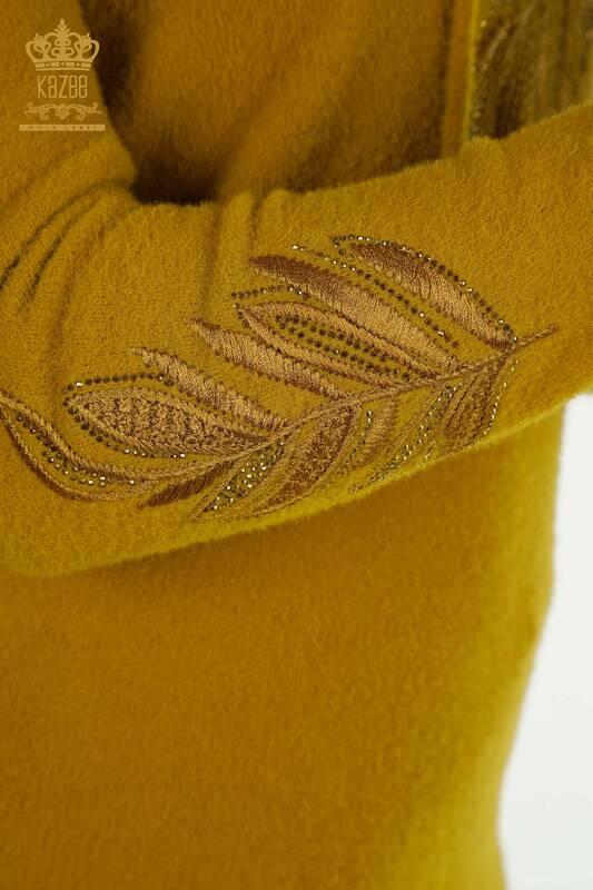 Hurtownia Sweterów Damskich z Dzianiny Z Kapturem Liść Angora Haftowane Kamień Musztardowy - 40008 | KAZEE