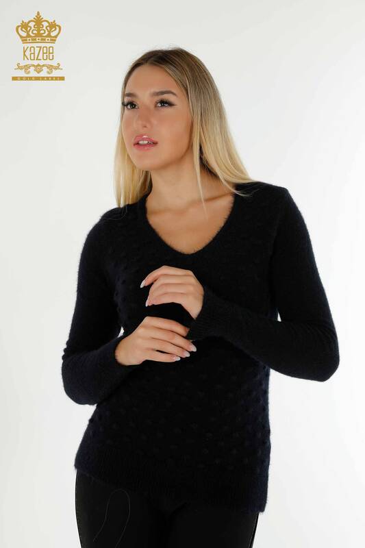 Hurtownia Sweterów Damskich Z Dzianiny Angora Wzorzyste Okrągły Dekolt Ciemny Granatowy - 18474 | KAZEE
