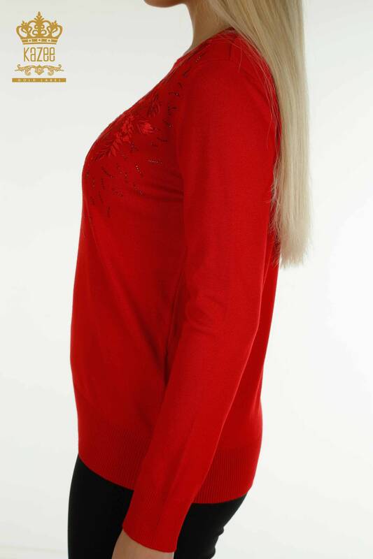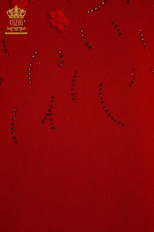Hurtownia Dzianiny Damskiej Wzorzyste Kwiatowe Kamienie Haftowane Z Długim Rękawem Czerwony - 16849 | KAZEE