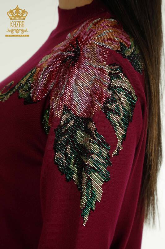 Hurtownia damska dzianiny sweter na ramię kwiat szczegółowy kolorowy haft z kamieniem liliowy - 30542 | KAZEE