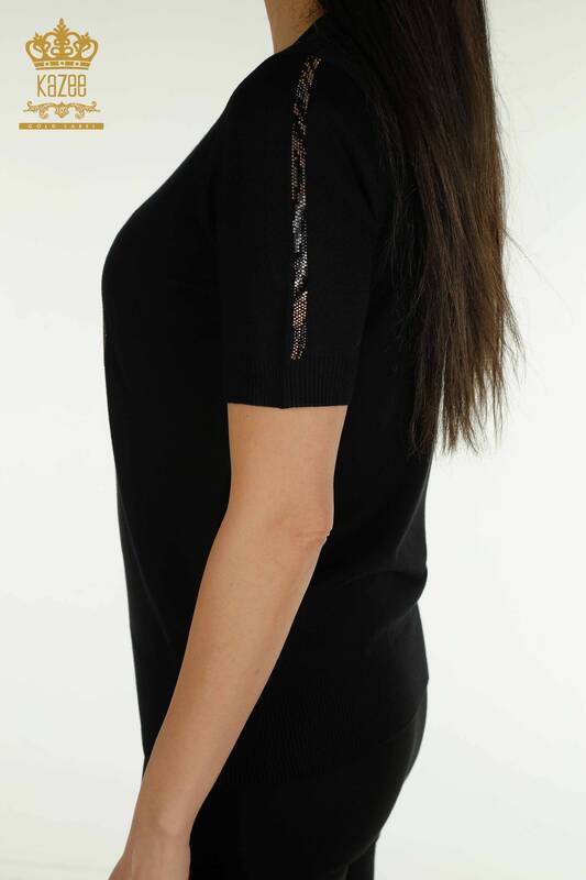 Hurtownia Sweterów Damskich z Dzianiny Lampart Kamień Haftowane Okrągły Dekolt Czarny - 30747 | KAZEE