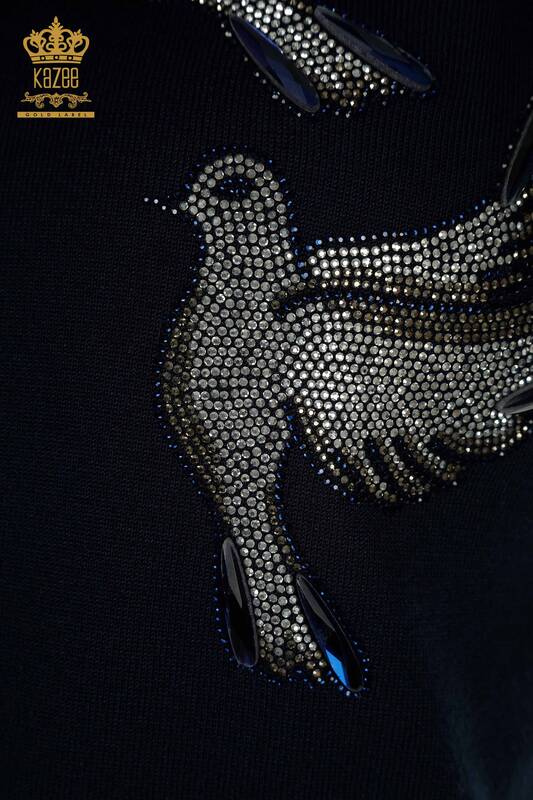 Hurtownia Swetra Damskiego z Dzianiny Ptak Haftowany Kamień Haftowany Granatowy - 30745 | KAZEE