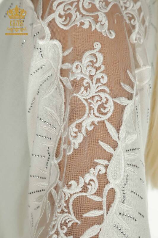 Hurtownia swetrów damskich z dzianiny, tiulowych, szczegółowych, haftowanych kamieniami, ecru - 15699 | KAZEE
